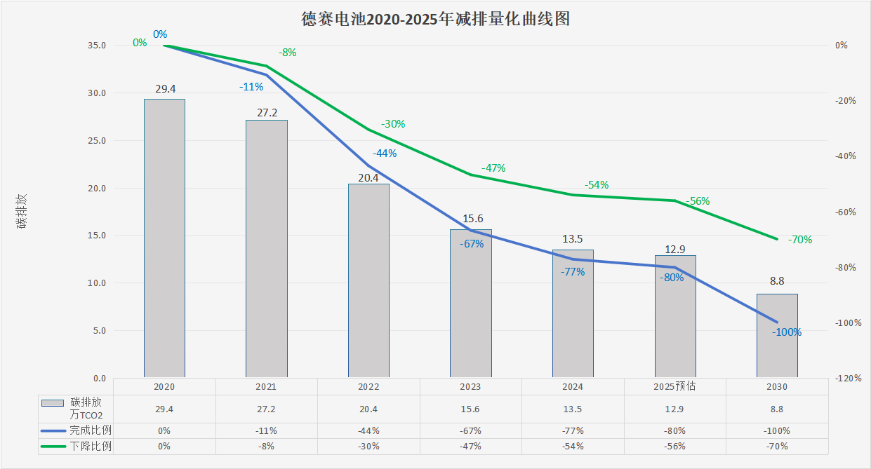 2020年德賽電池(仲愷工業(yè)園)的范圍1、2、3碳排放總量約為29.4萬噸,德賽電池通過不懈努力,僅至2024年,公司已成功將碳排放總量削減至約13.5萬噸(已完成77%的目標),實現(xiàn)相對于基準年碳排放總量54%的顯著減排,2025年預(yù)計碳排總量約為12.9萬噸(預(yù)計完成80%的目標),實現(xiàn)相對于基準年碳排放總量56%的顯著減排。