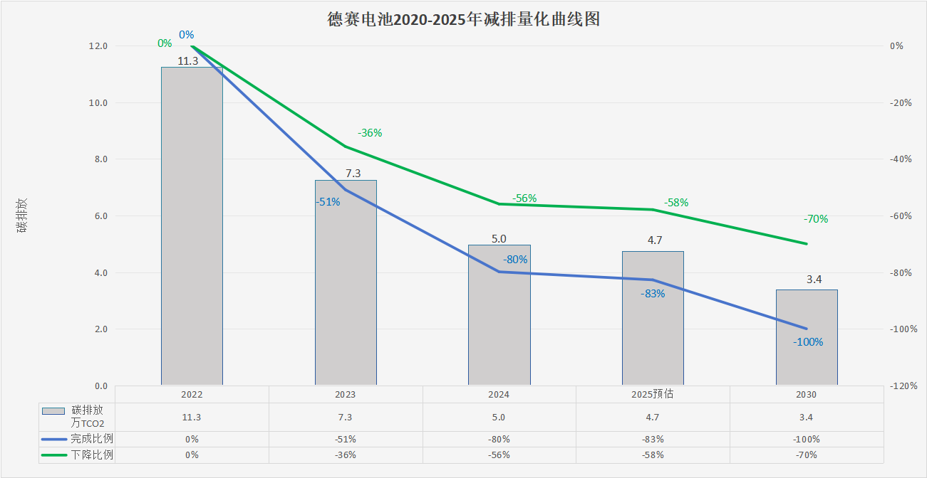 2022年德賽電池(惠南工業(yè)園)的范圍1、2、3碳排放總量約為11.3萬噸,德賽電池通過不懈努力,僅至2024年,公司已成功將碳排放總量削減至約5.0萬噸(已完成80%的目標),實現(xiàn)相對于基準年碳排放總量56%的顯著減排,2025年預(yù)計碳排總量約為4.7萬噸(預(yù)計完成83%的目標),實現(xiàn)相對